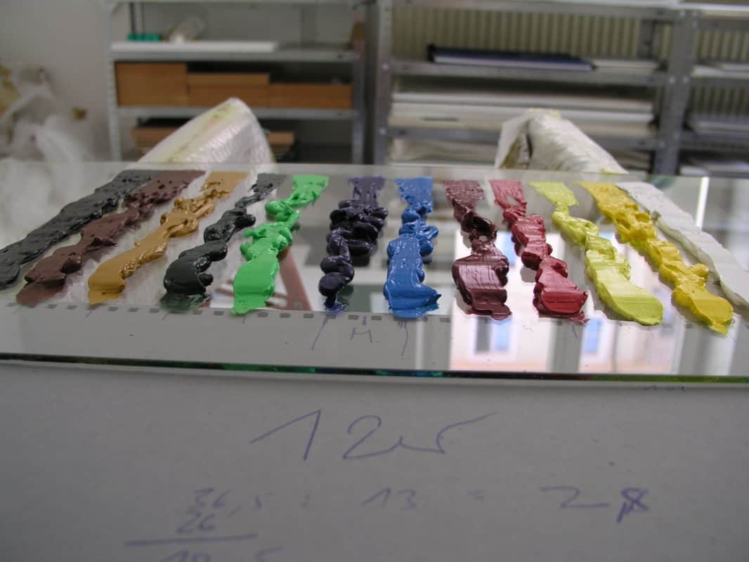 Ölfarbe wird auf eine Glasplatte aufgetragen und wie beim Vorgang des Palettenreinigens auf ein Blatt Papier aufgeschoben.